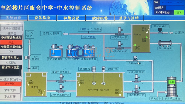 PLC软件编程全自动控制,液晶触摸显示。控制中水处理利用系统全自动化(开取水点自动来水);实时监测调蓄池水量、处理流量、各设备运行状态,施耐德元器件,可以对中水系统中调节池、反应池、清水池液位做准确监控;对净化水泵和供水水泵进行(手段/自动)控制,使其工作稳定,可靠,节能;同时可以保护水泵空转等现象出现,在原水缺乏时,手动/自动切换到自来水补水状态,保证系统持续工作。整套系统配备云智慧平台,可通过网络、电脑、手机端维护及运营。